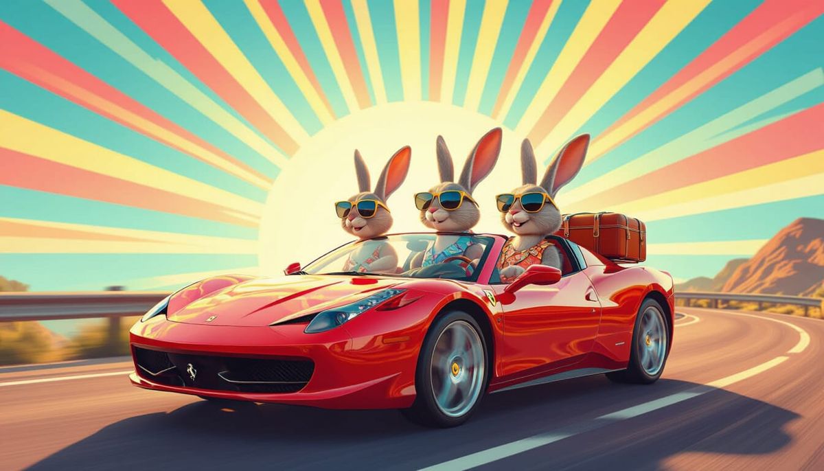 This image shows anthropomorphic rabbits on a road trip in a red Ferrari. The 3D rendering is reminiscent of Pixar films, with bright colors, detailed textures, and cinematic lighting.
