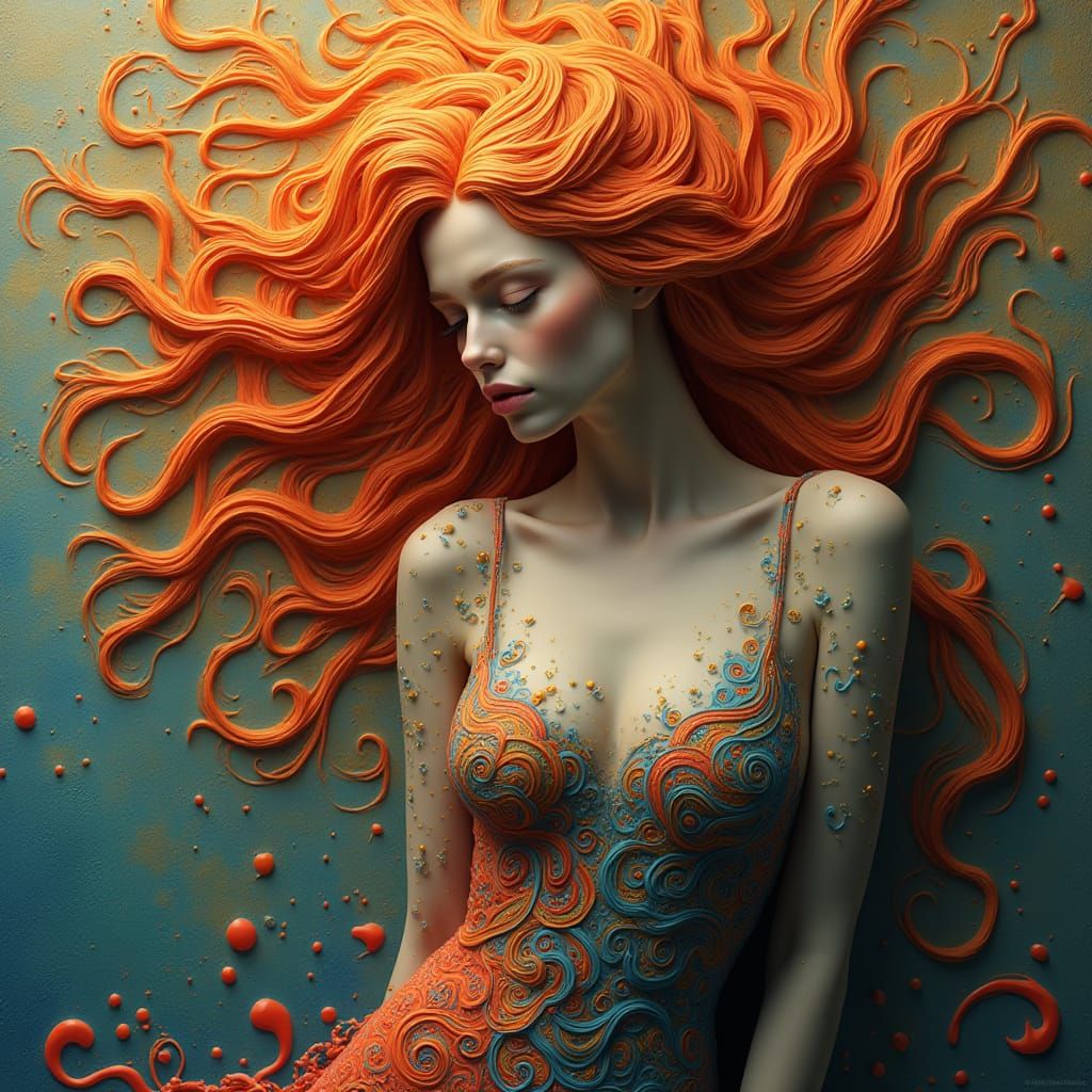 This image depicts a woman with vibrant, flame-like hair and a swirling patterned dress, set against a surreal, melting background with bold color fields and symbolic elements, blending abstract fractal and Zentangle details in 3D shading with glowing textures.