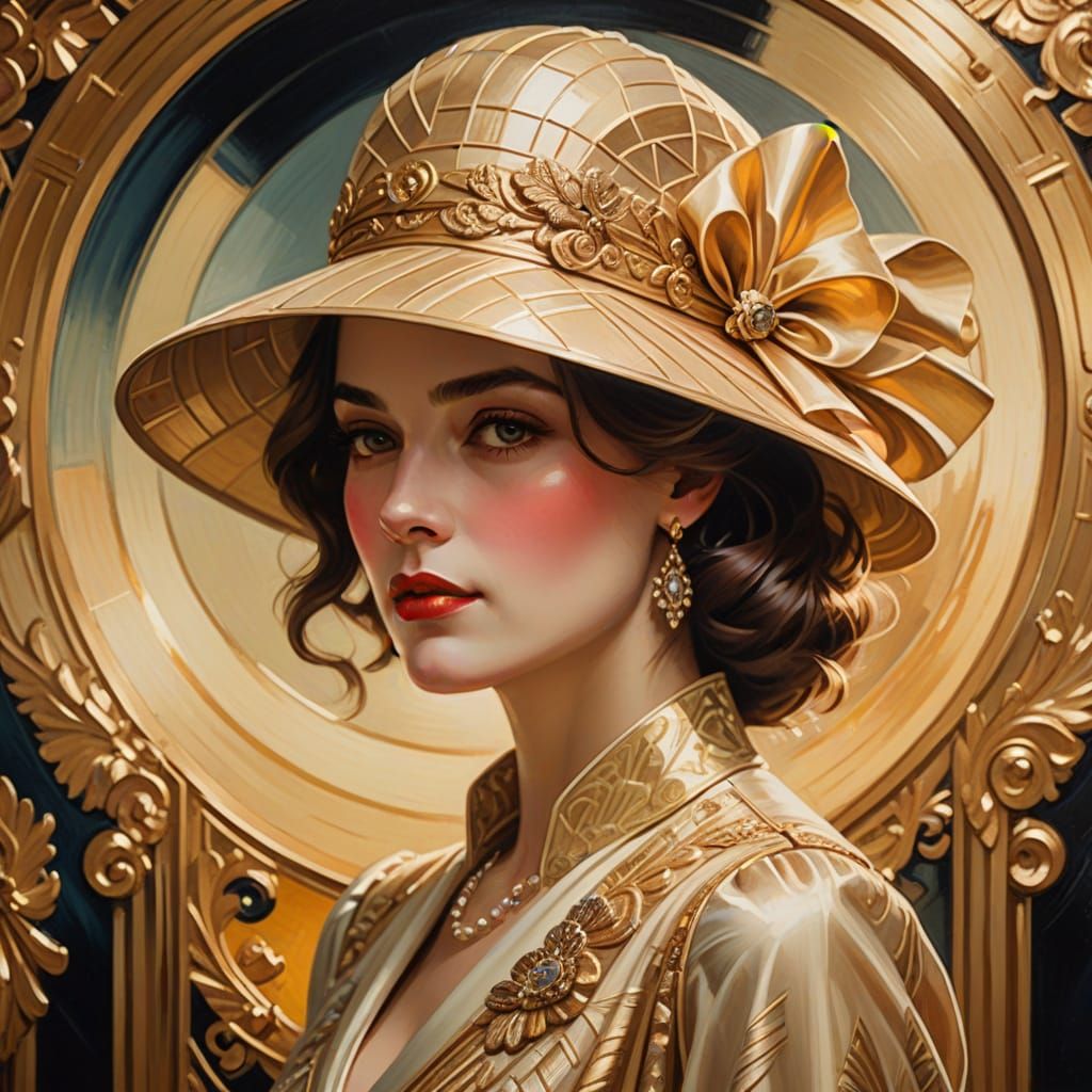 A close-up oil painting of a lady holding her hat in place, set in a warm and luxurious Art Deco scene with soft brushstrokes and vintage color palette.