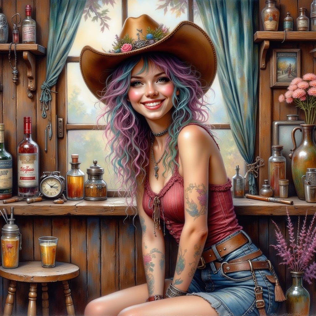 A watercolor painting of a woman in a cowboy hat and mini skirt in a rustic saloon. The artwork is highly detailed with dramatic lighting, reminiscent of fine art.