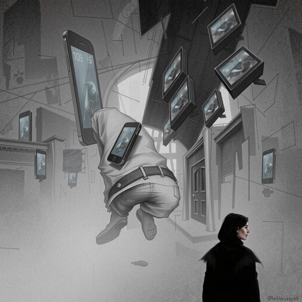 A striking picture of a modern woman in a hoodie amidst dystopian ruins. The artwork is rendered with stark contrasts and expressive brushwork, creating a haunting, emotional scene in a romantic style.