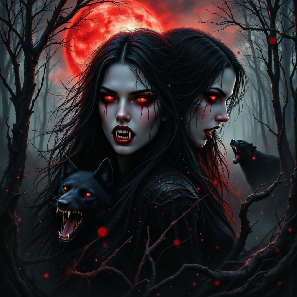 A striking double exposure image of two vampire women's faces back-to-back, set against a blood-red moon and misty forest. Rendered in a dramatic, impasto oil painting style with deep crimson and obsidian hues.
