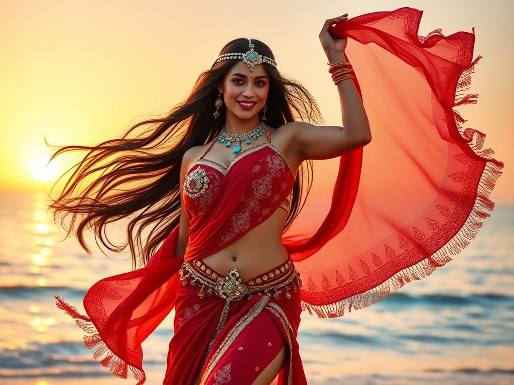 This image showcases a breathtakingly beautiful young Arabian belly dancer, set against a serene beach backdrop at sunset, with intricate details and vibrant colors blending Arabic culture and oceanic serenity.