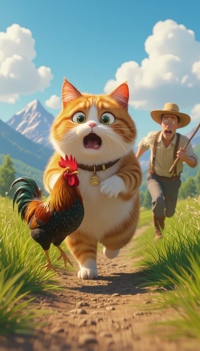 A comical image of a frightened cat clutching a rooster. They flee a man with a stick on a vibrant green path under a blue sky. Rendered as digital art with dynamic lighting.
