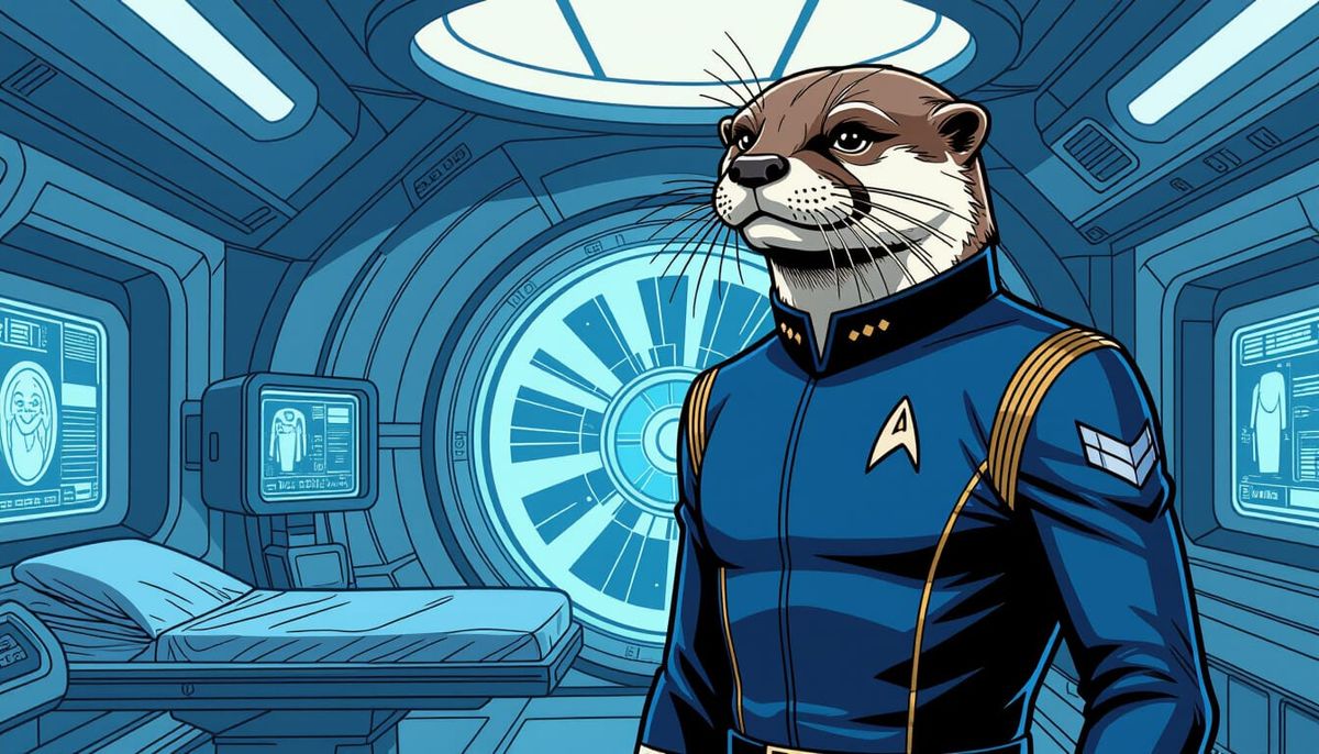 A striking picture of an anthropomorphic otter in a Starfleet uniform, standing heroically in the U.S.S. Enterprise's medical bay. The image is rendered in a smooth comic book art style.
