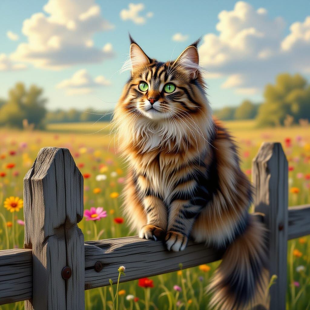 This image shows a long-haired tabby cat perched on a wooden fence, observing a wildflower meadow. The hyperrealistic digital artwork features intricate details and soft, ethereal lighting.