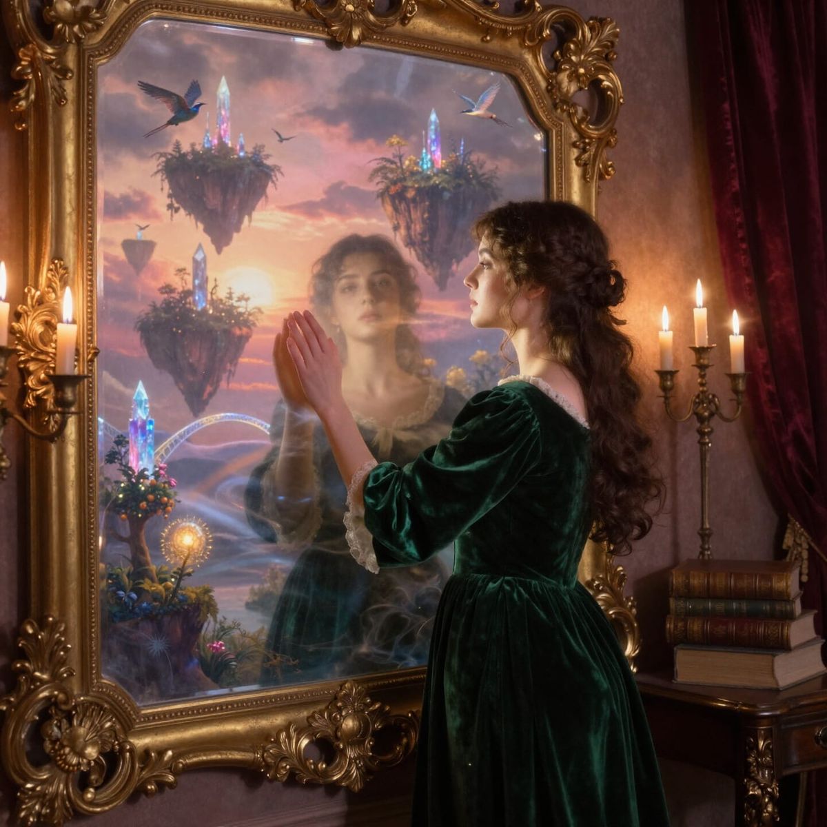 This oil painting shows an elegant woman before a gilded mirror. Instead of her reflection, the mirror reveals a breathtaking fantasy realm with floating islands and crystalline towers.