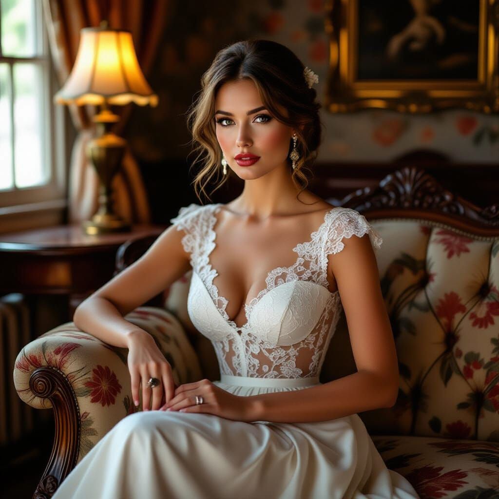 This image shows an elegant woman in vintage lace lingerie, seated on an antique sofa. The photograph, reminiscent of Ansel Adams' style, features fine details and textures in a nostalgic atmosphere.