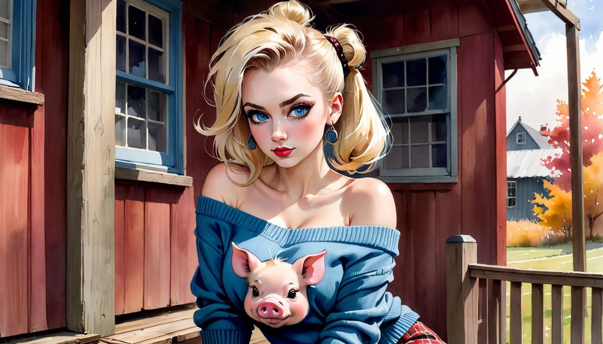 This AI-generated image features a cute, alluring blonde woman with big blue eyes, wearing an oversized off-shoulder sweater. The scene captures a whimsical, coy pose against a rustic backdrop with an abstract watercolor wash effect.