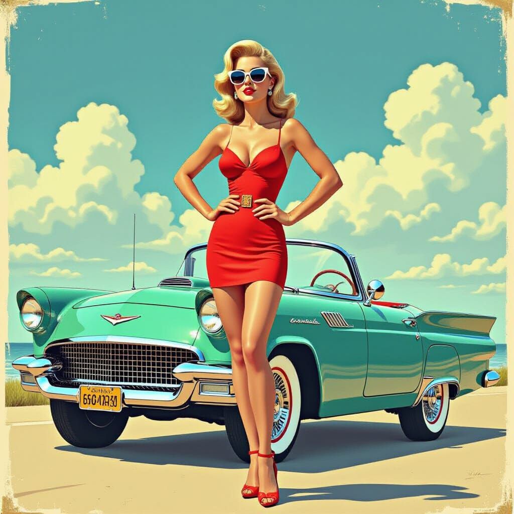 A hyperrealistic 1950s advertising poster featuring a stylish lady in sunglasses before a vintage sports car. Intricate details, HDR, and cinematic lighting create a moody, atmospheric scene.