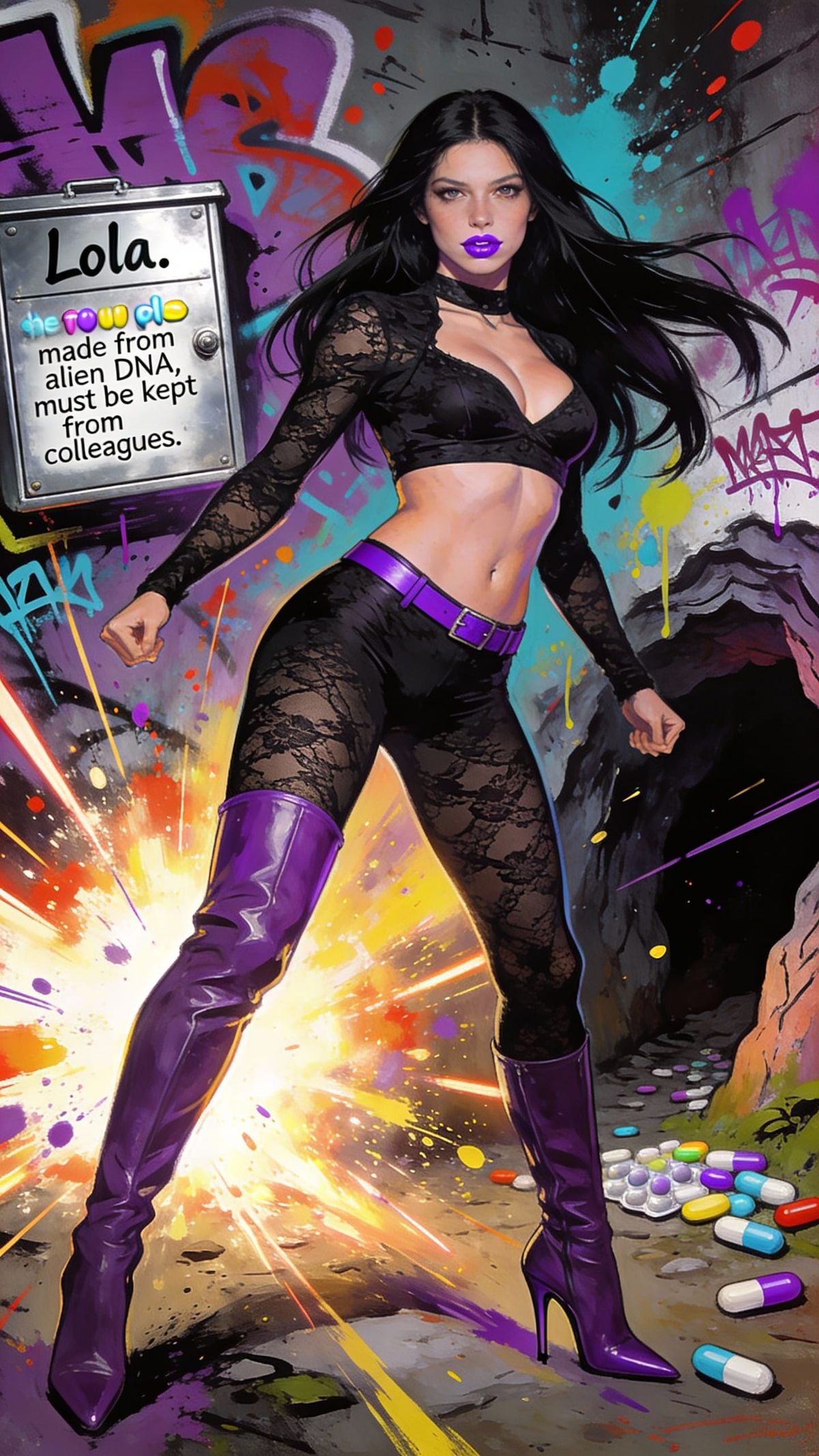 This image depicts a woman transformed by alien DNA, rendered in a vibrant graffiti art style with high contrast and polychromatic colors. The art features spray paint and oil gouache techniques.