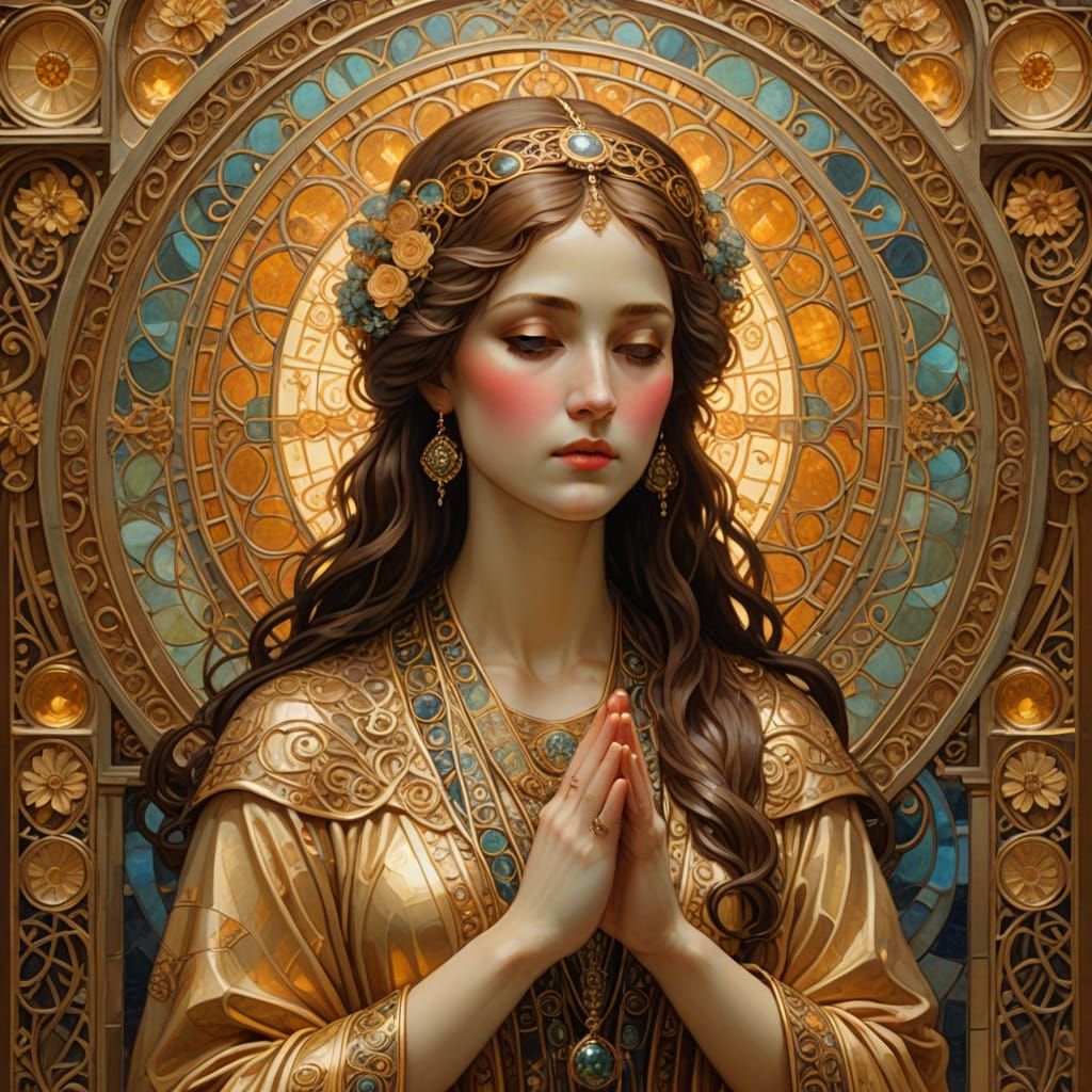 A golden-robed woman prays in this Art Nouveau style image. Geometric patterns, shimmering spirals, and mosaic-like details create a spiritual ambiance in soft pastel colors.