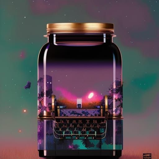 A typewriter in a jar by Simon Prades, Dan Mumford, russ mills, Junji ito, purple double exposure collage art, ink details, soft purple color scheme, bright purple UHD, 8k resolution, editorial art, complex hyperdetailed, beautiful composition, a modern surrealistic masterpiece, fantasy