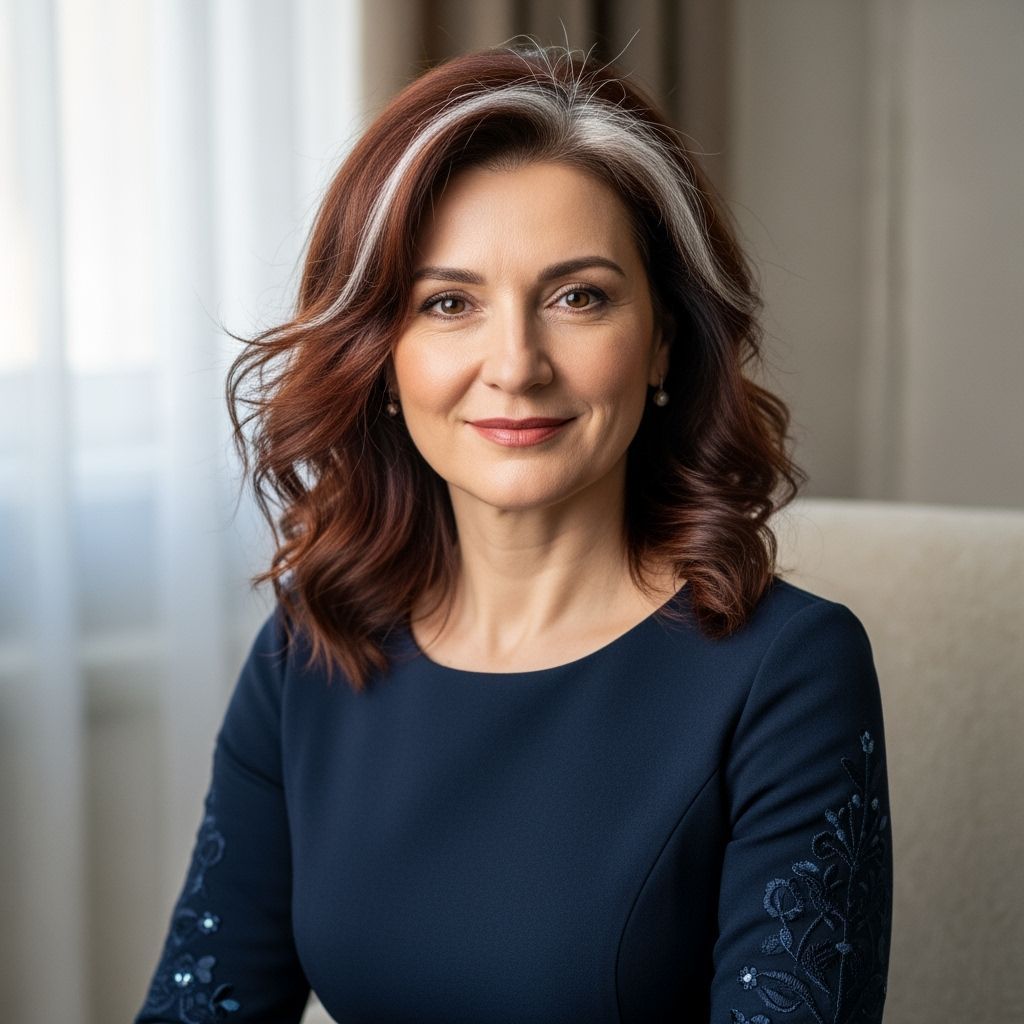 A realistic portrait of a 45-year-old Romanian woman with auburn hair and silver streaks, wearing a navy dress with embroidery, in a softly lit Bucharest apartment. The image has a hyperrealistic photographic style.