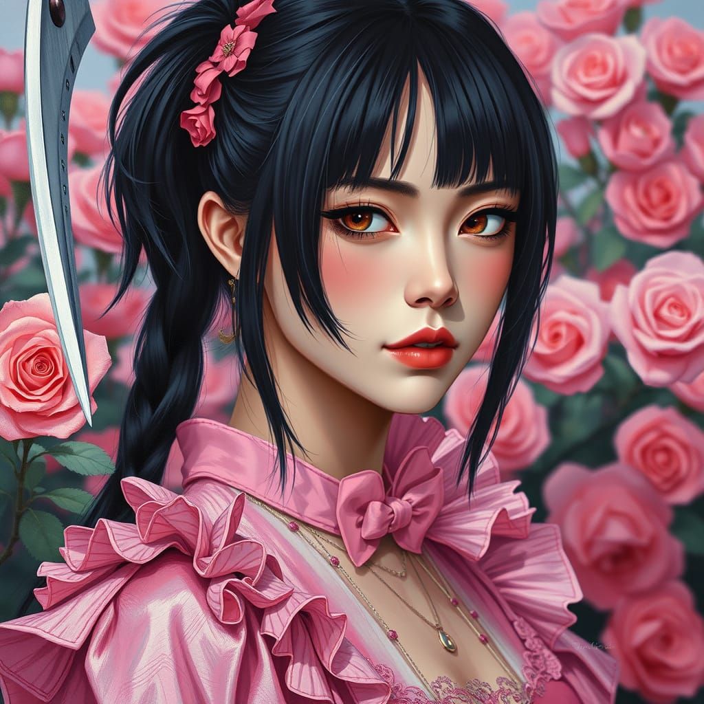 This image shows a young woman with striking visual kei black hair and pale skin, wearing flamboyant fantasy pink clothes, holding a halberd in a bokeh rose garden setting