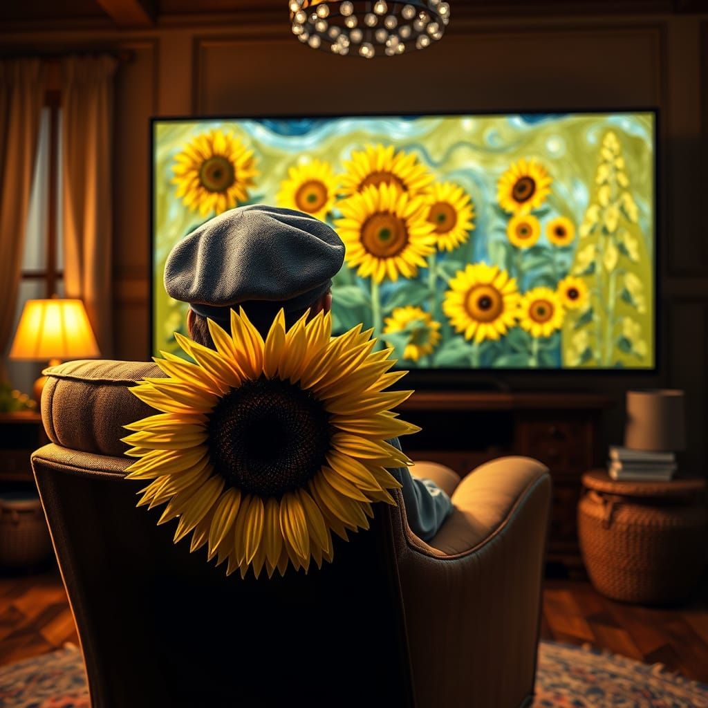 A sunflower in a beret watches Van Gogh's art on a TV. The image features thick brushstrokes and a bold color palette, evoking a post-impressionist aesthetic.