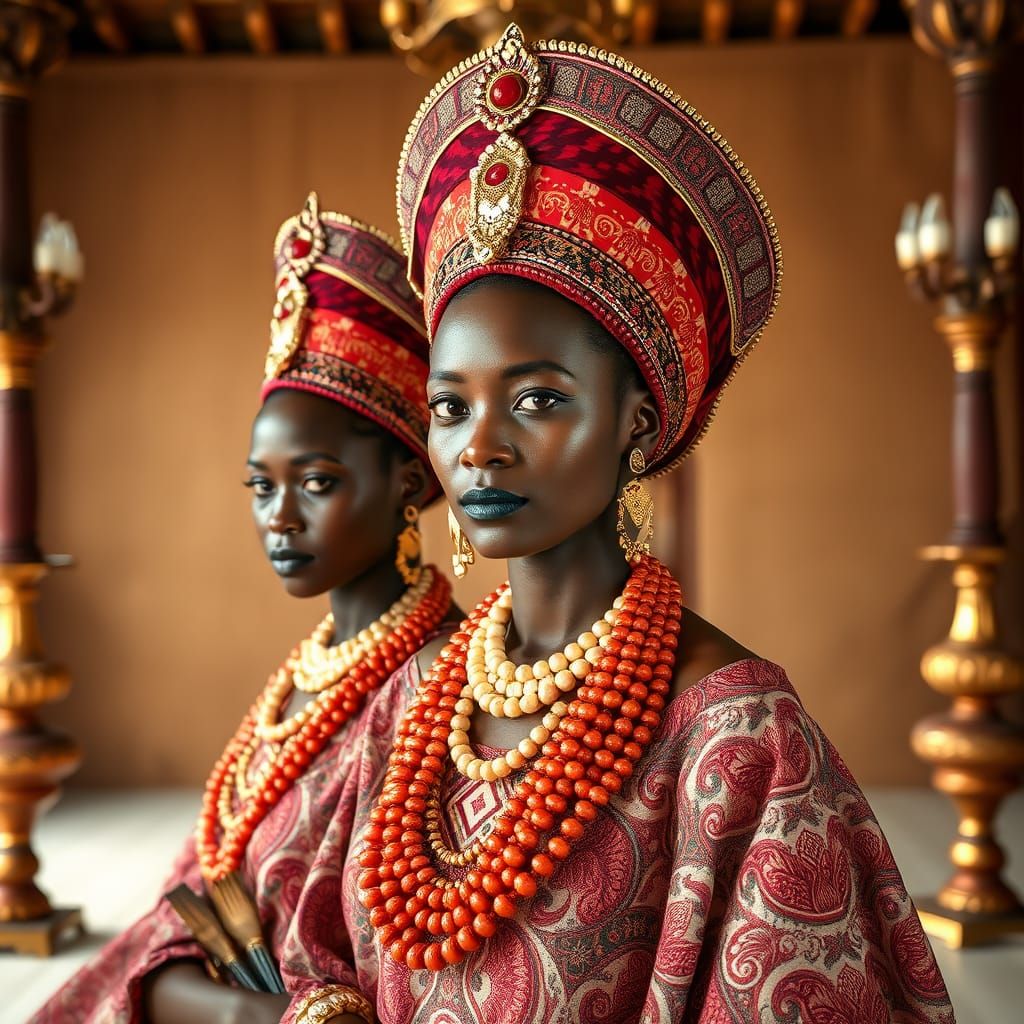 This image shows a princess in traditional Benin regalia, surrounded by the opulence of the emperor's court, with intricate patterns, coral beads, and ornate headpieces, in a vibrant and colorful aesthetic.