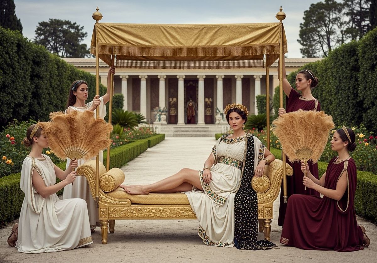 This image shows Empress Messalina in a lavish toga relaxing on a golden divan in her palace gardens. Servants attend to her, creating a cinematic and detailed scene in a photograph with natural lighting.