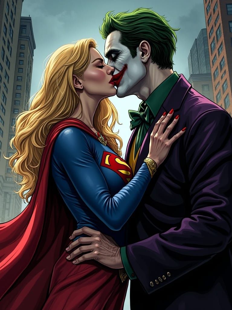 This image shows Supergirl kissing the Joker against a Gotham City backdrop. The artwork is designed as a comic book cover, displaying a dramatic and unexpected scene.