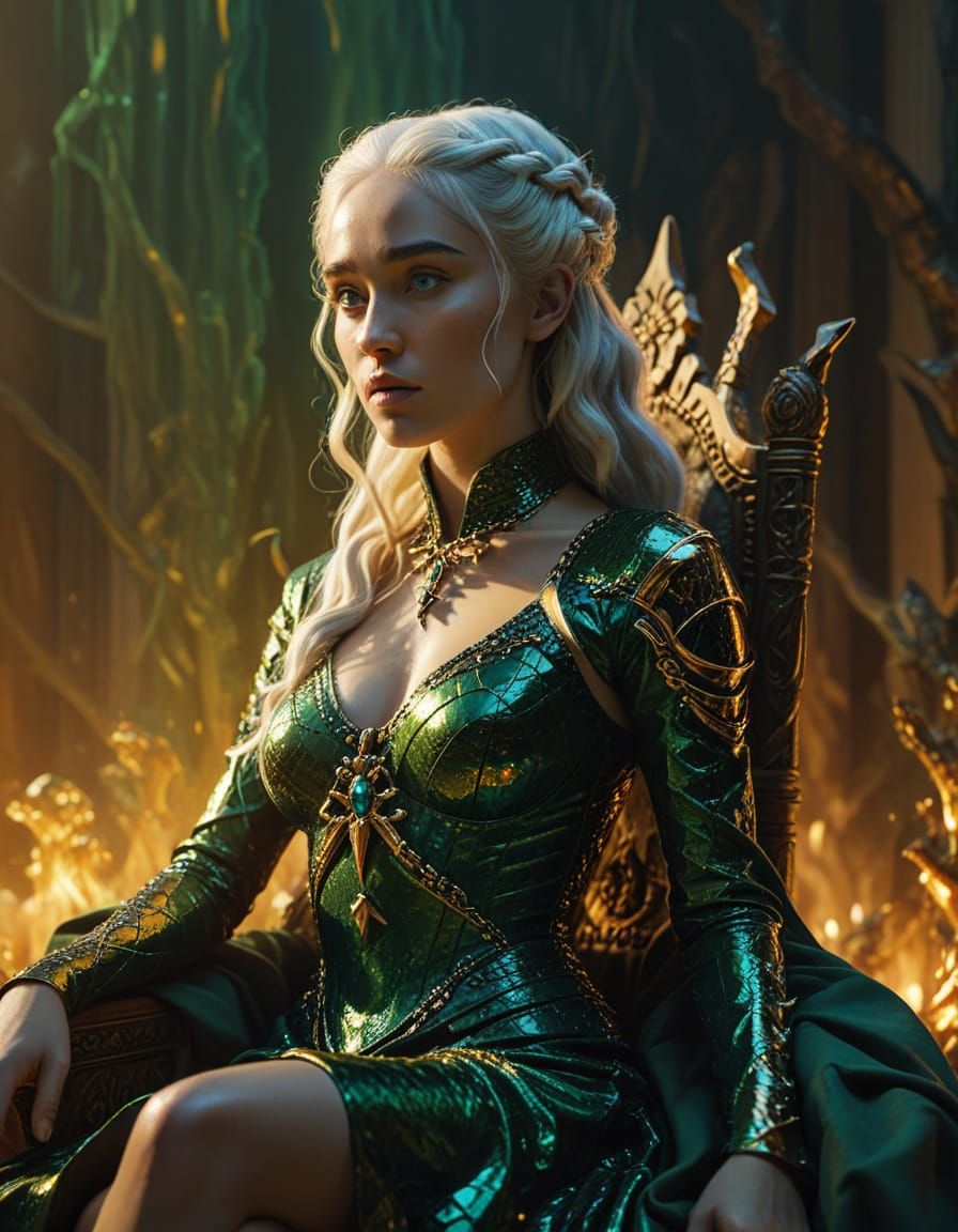 A surreal close-up portrait of a powerful queen sitting on a gothic throne, surrounded by vibrant, dreamlike colors and dramatic lighting, evoking the essence of Salvador Dali's oil paintings.