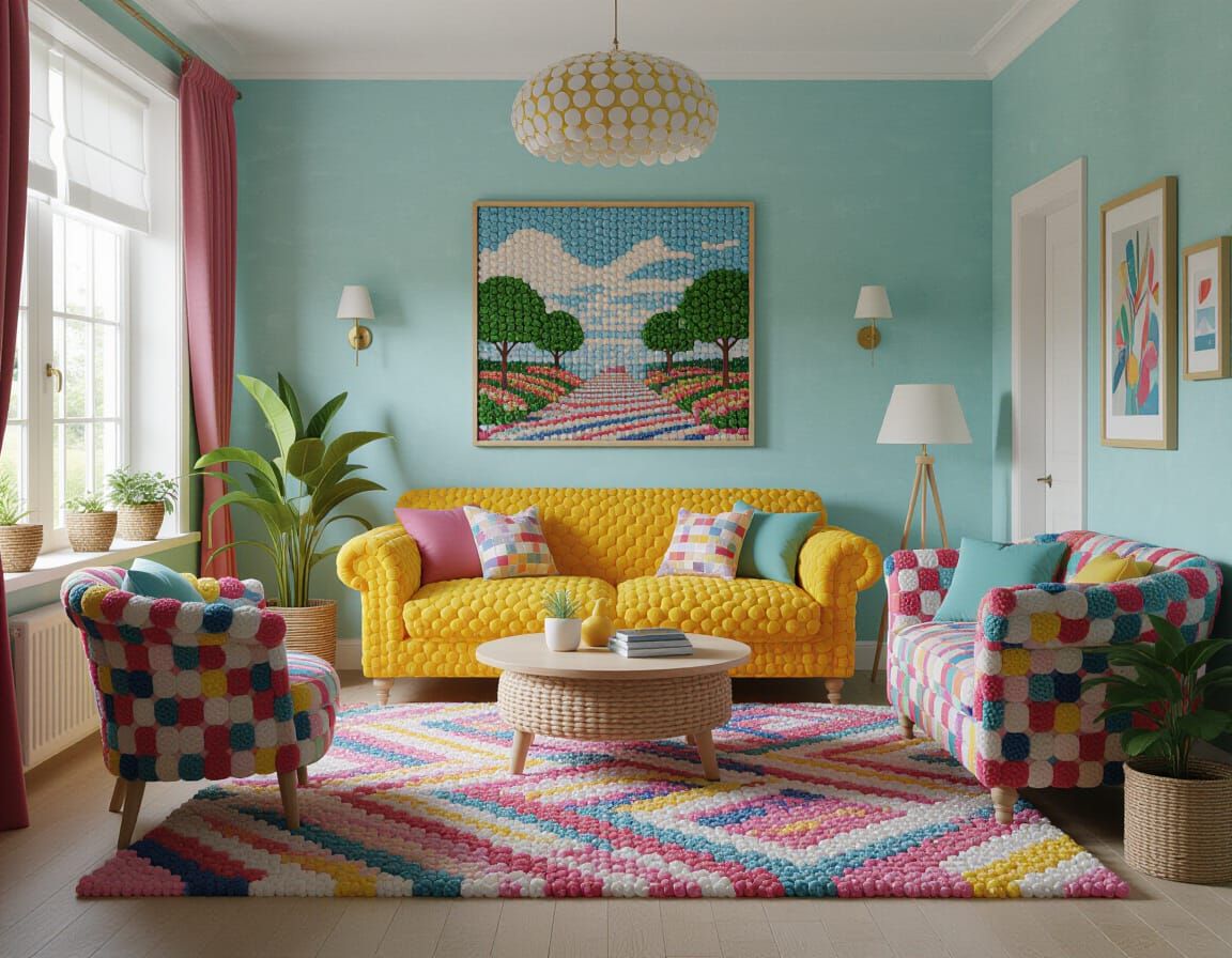 This image shows an intricately detailed living room constructed entirely of pom poms, set within a surreal pom pom street. The image is hyperrealistic and rendered in 8k.