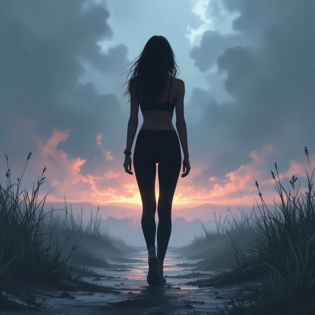 This image shows a slender young woman in black leggings walking away in a mystical atmosphere. The artwork blends digital painting with cinematic lighting in a futuristic style.