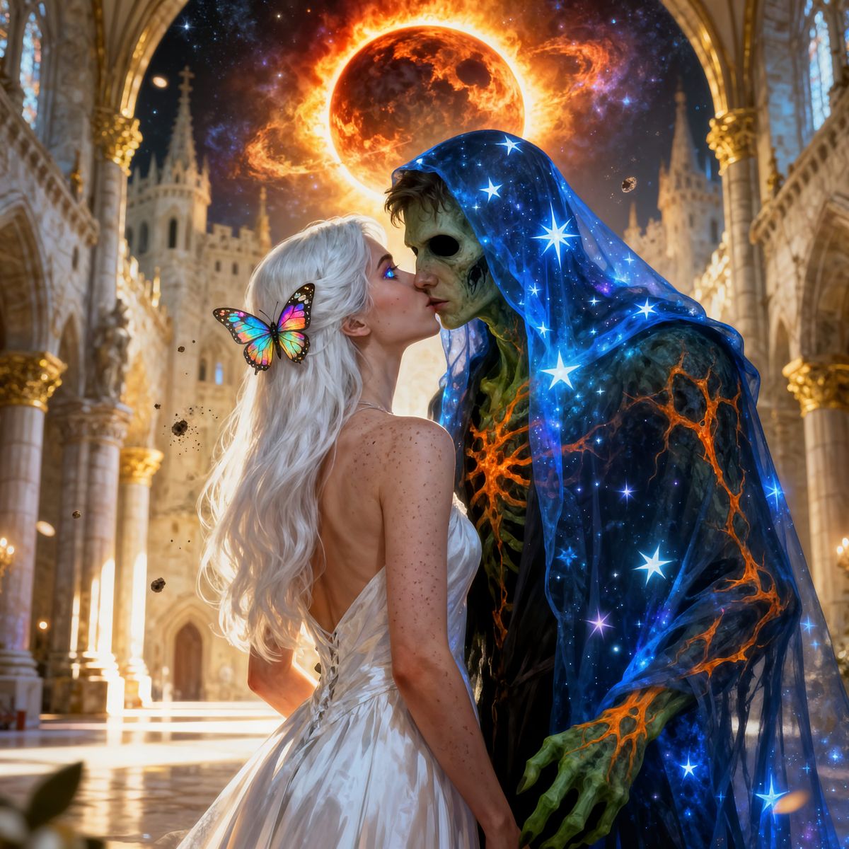 A hyperrealistic image of a woman with long white hair in a flowing dress sharing a kiss with a menacing Grim Reaper figure. The Reaper wears a cosmic nebula veil.