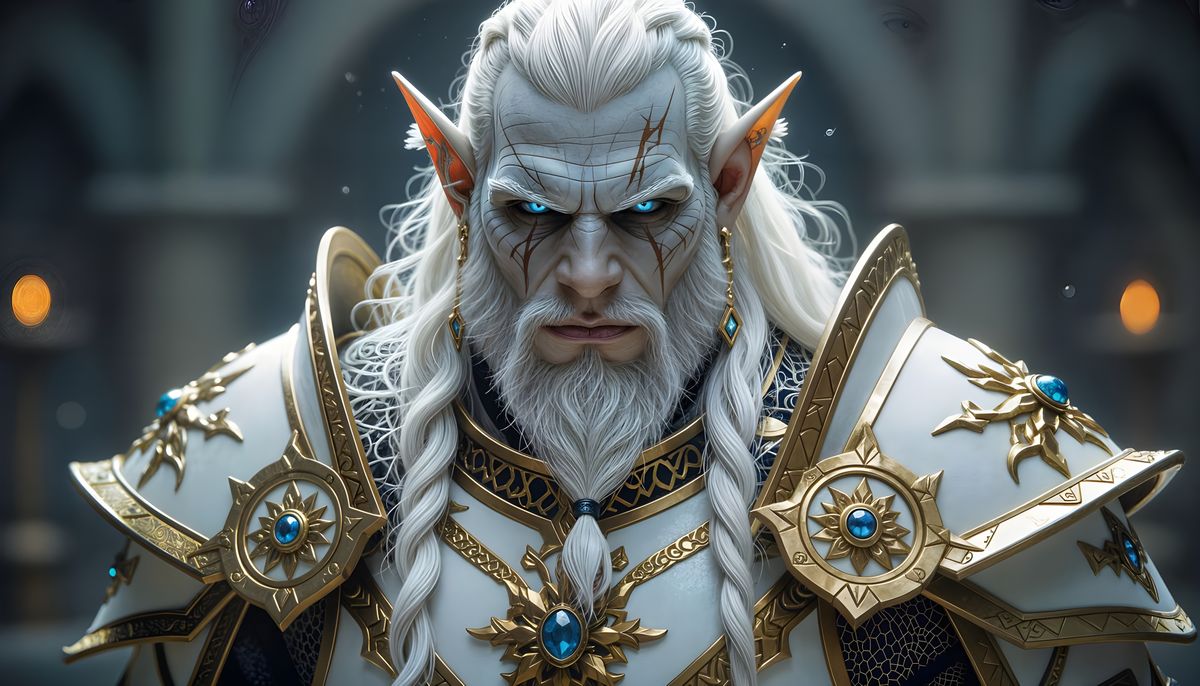 This hyperrealistic image showcases an albino orc warlock in immaculate white and gold armor. Featuring intricate details, sharp focus, and a moody, atmospheric cinematic style.