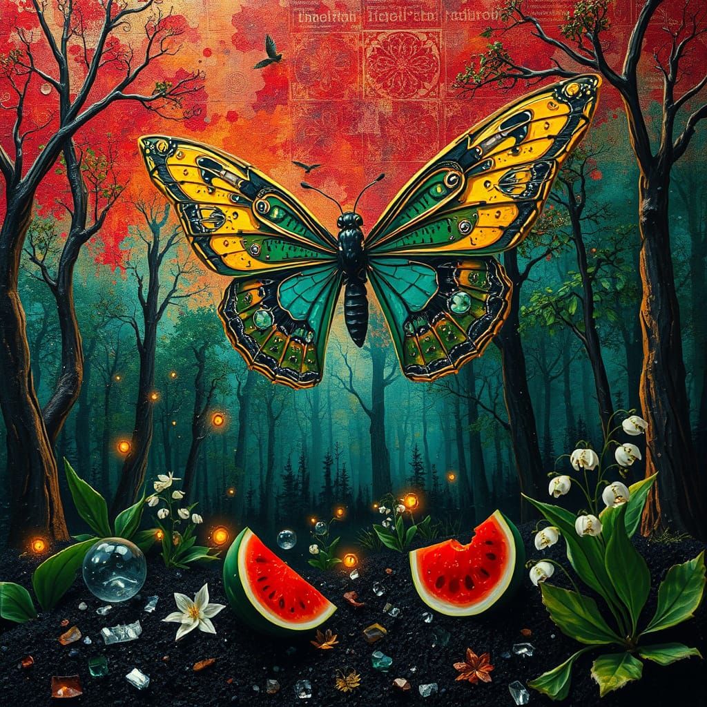 This image shows a mechanical butterfly with circuit board wings flying over a surreal, abstract landscape. Rendered as an oil painting with vibrant colors and intricate details.