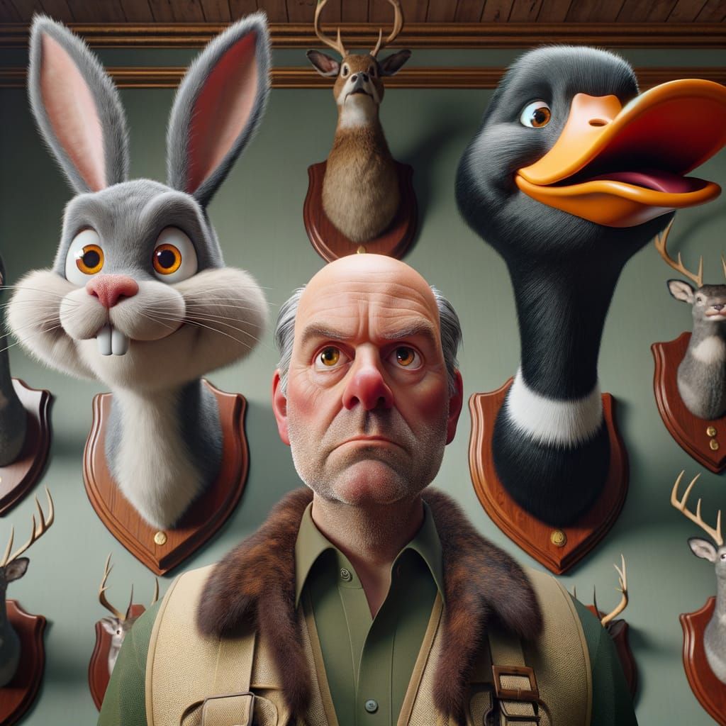 This image shows a hunter in a trophy room with cartoon rabbit and duck heads mounted on the wall. The scene captures the man's unusual passion for hunting cartoon characters, rendered as inanimate trophies.