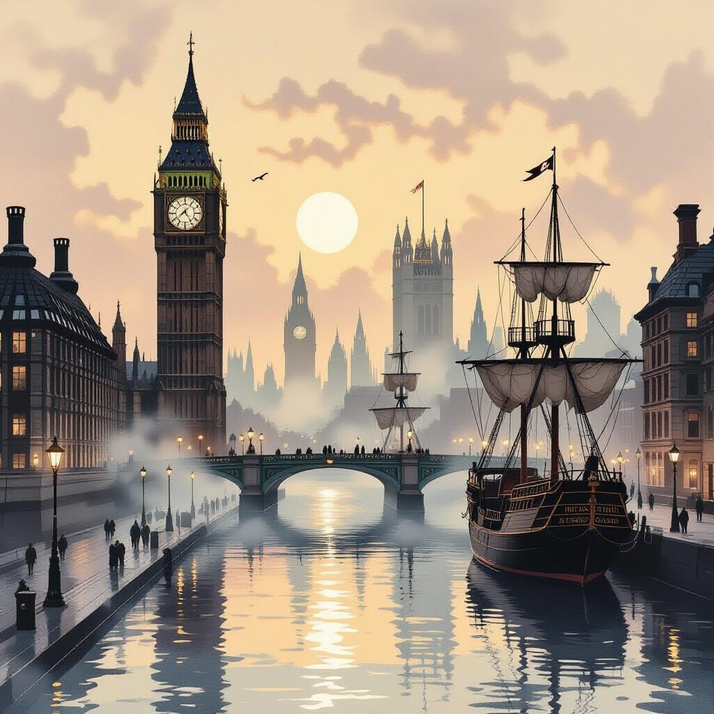 A sepia-toned image of a deserted London street at midnight. Big Ben and London Bridge are visible in the background, with a pirate ship docked in the misty harbor. The image is rendered with soft, diffused light and pastel colors.