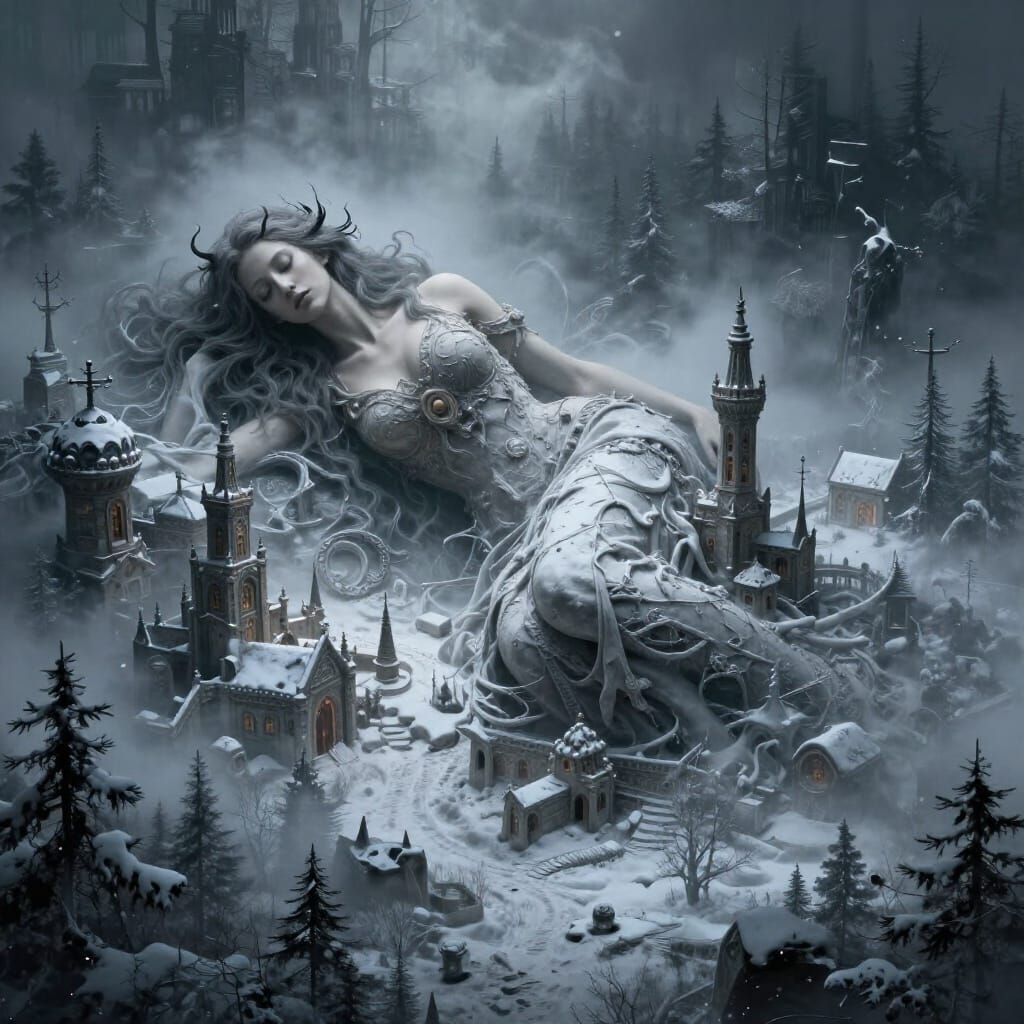 Easily generate unique winter landscape images, inspired by this sleeping woman. Free and flexible AI image creation.