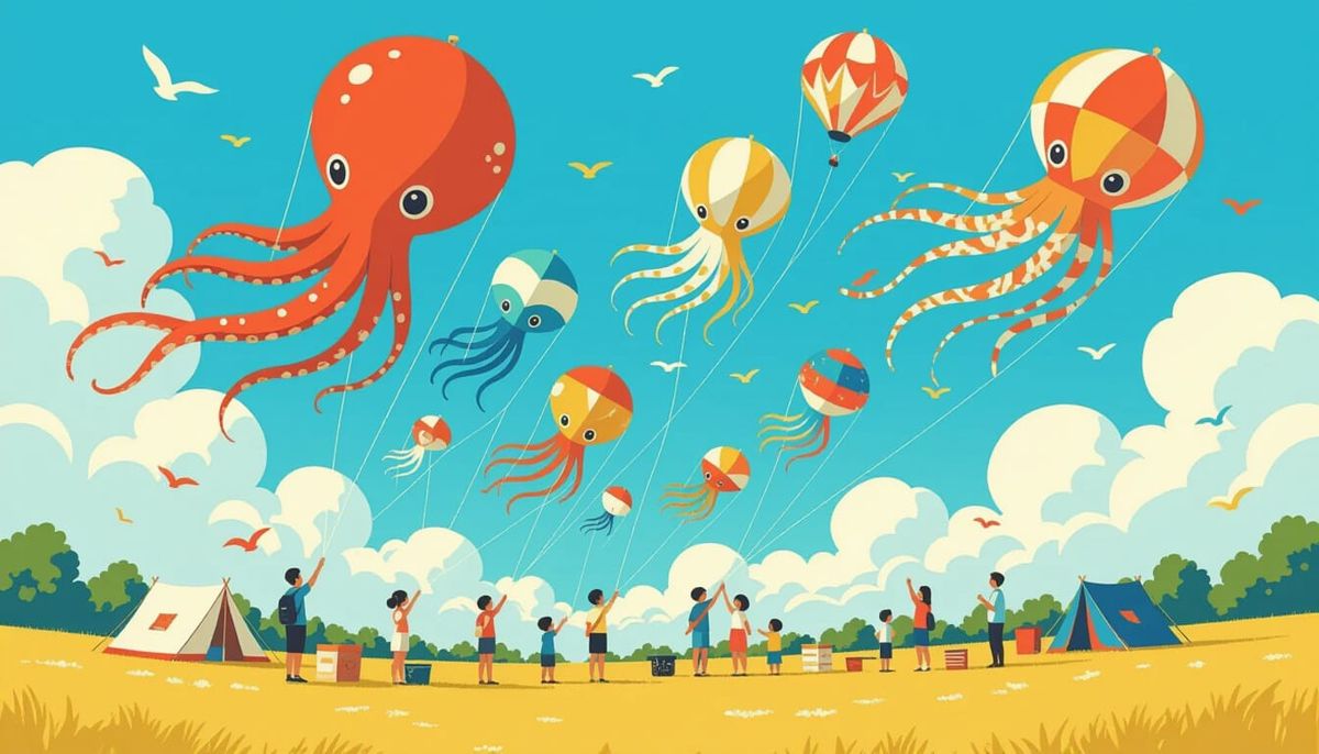 A vibrant scene of kites in many shapes and sizes fill the sky. Families gather in a grassy field for a kite festival, rendered with bright colors and whimsical style.