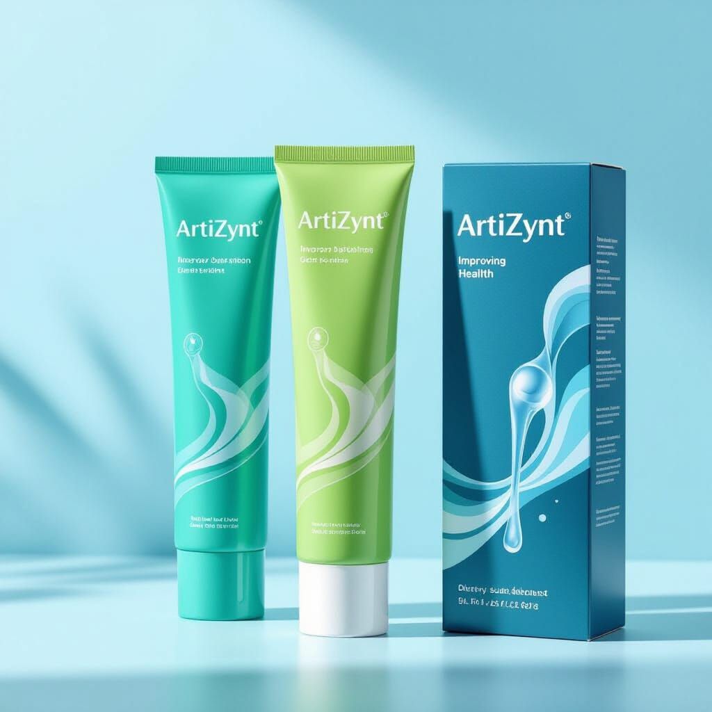 This image features a clean, modern package design for ArtiZynt, a health-focused gel supplement for joint health. It uses a vibrant green and blue palette with studio lighting.