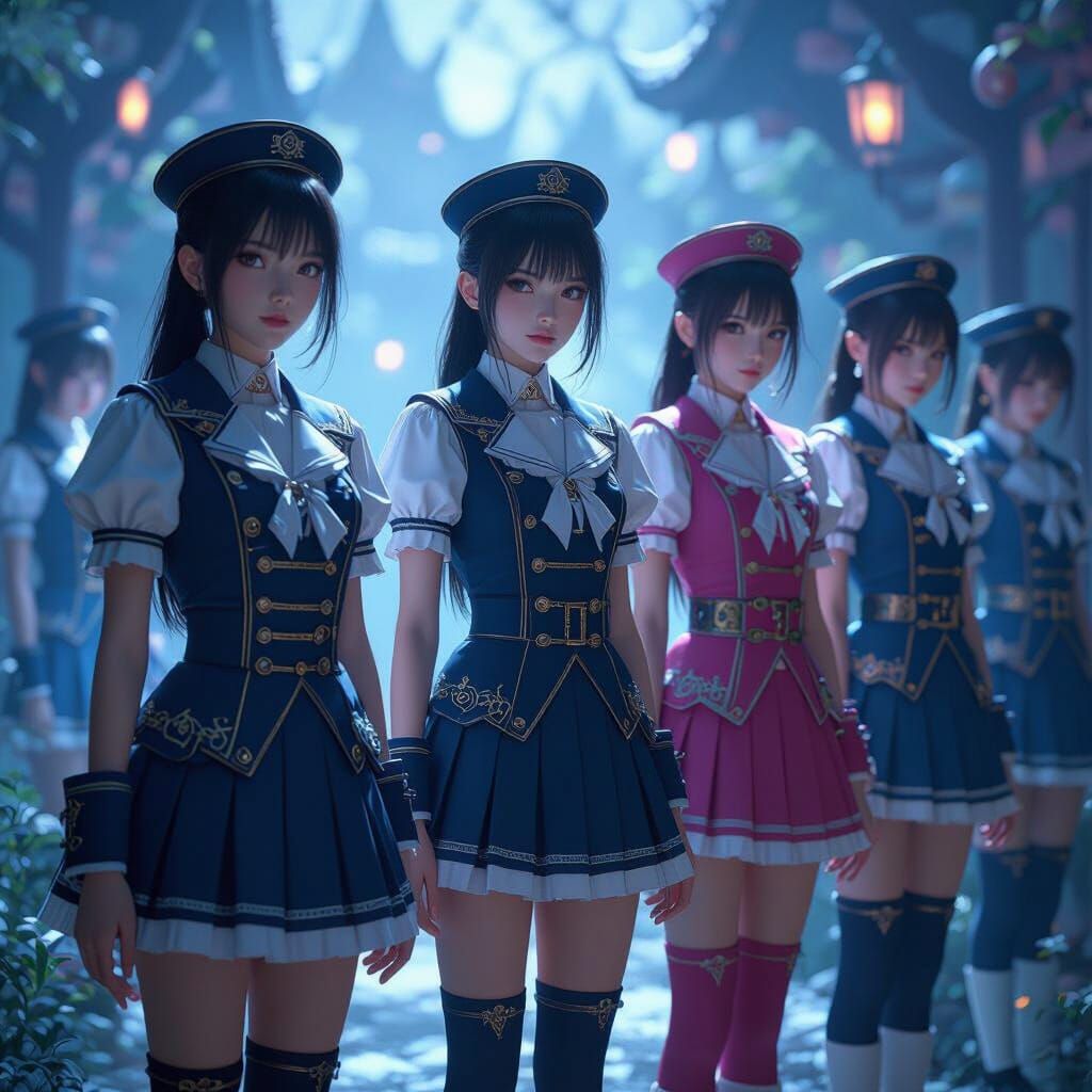 This image shows school girls in detailed, fantastical uniforms with deep, complementary colors. The concept art features intricate details and dramatic lighting, rendered in 8k for a polished look.