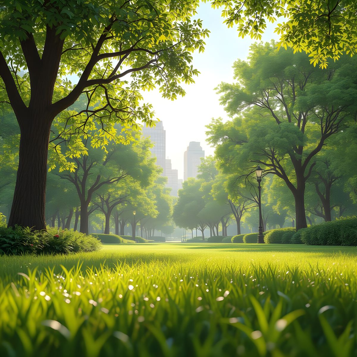A realistic, low-angle shot of a vibrant city park. Tall trees and foliage reach skyward, bathed in soft, filtered sunlight, creating a cinematic and detailed scene.