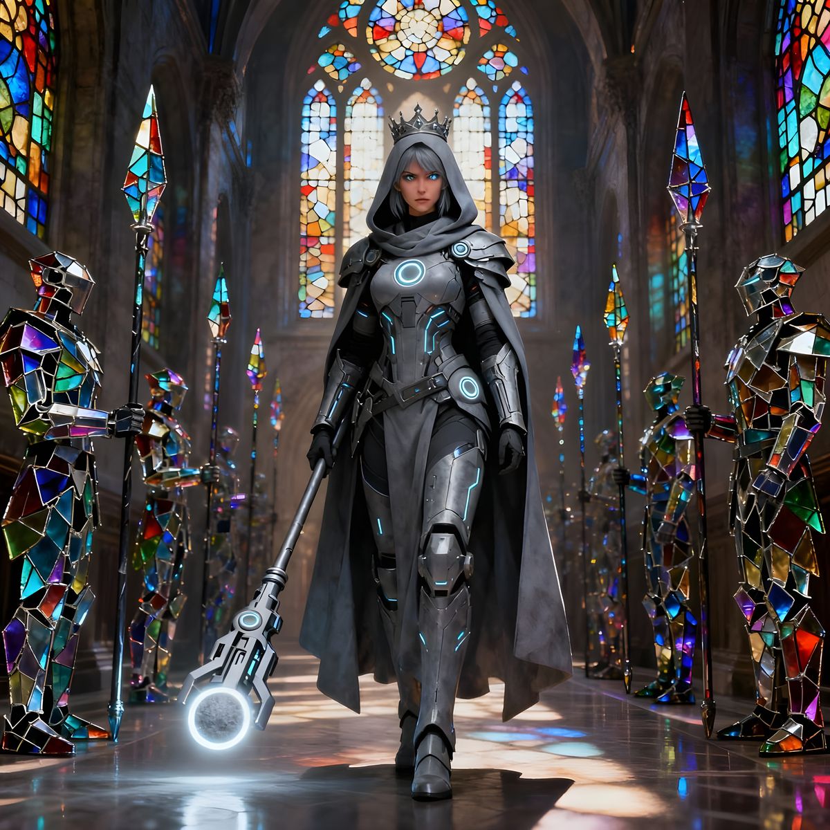 A stern techno-mage with grey hair and advanced armor stands in a hall filled with colorful stained glass. Guards made of shattered glass stand watch.