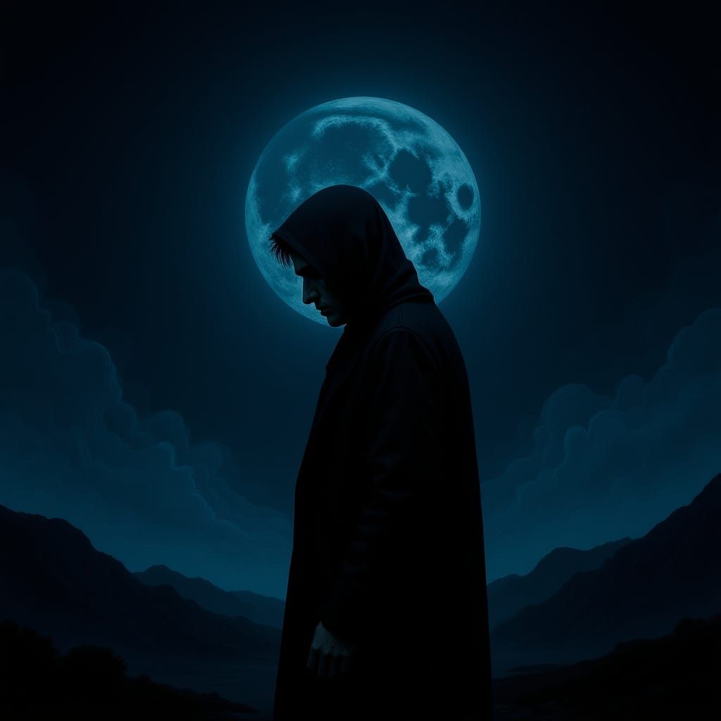 This image shows a solitary figure in a misty, desolate landscape, lost in thought. The moonlit scene evokes melancholy through bold brushstrokes and dreamy textures, with a futuristic aesthetic.