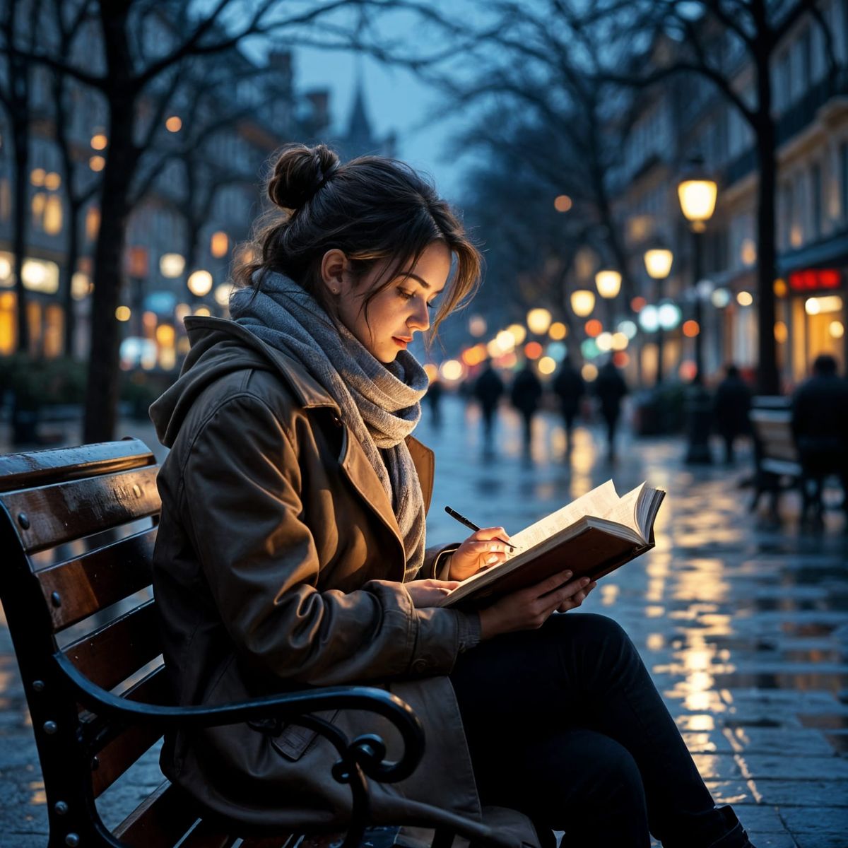 This image shows a woman sketching in a notebook in a busy city park at dusk. Expressive brushstrokes and cinematic lighting create a moody, impressionistic feel.