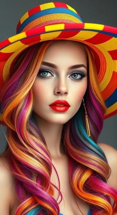 A hyperrealistic portrait of a woman with rainbow hair and blue eyes, adorned with a striped hat and gold earrings. The soft focus and muted background enhance the artistic and glamorous aesthetic.