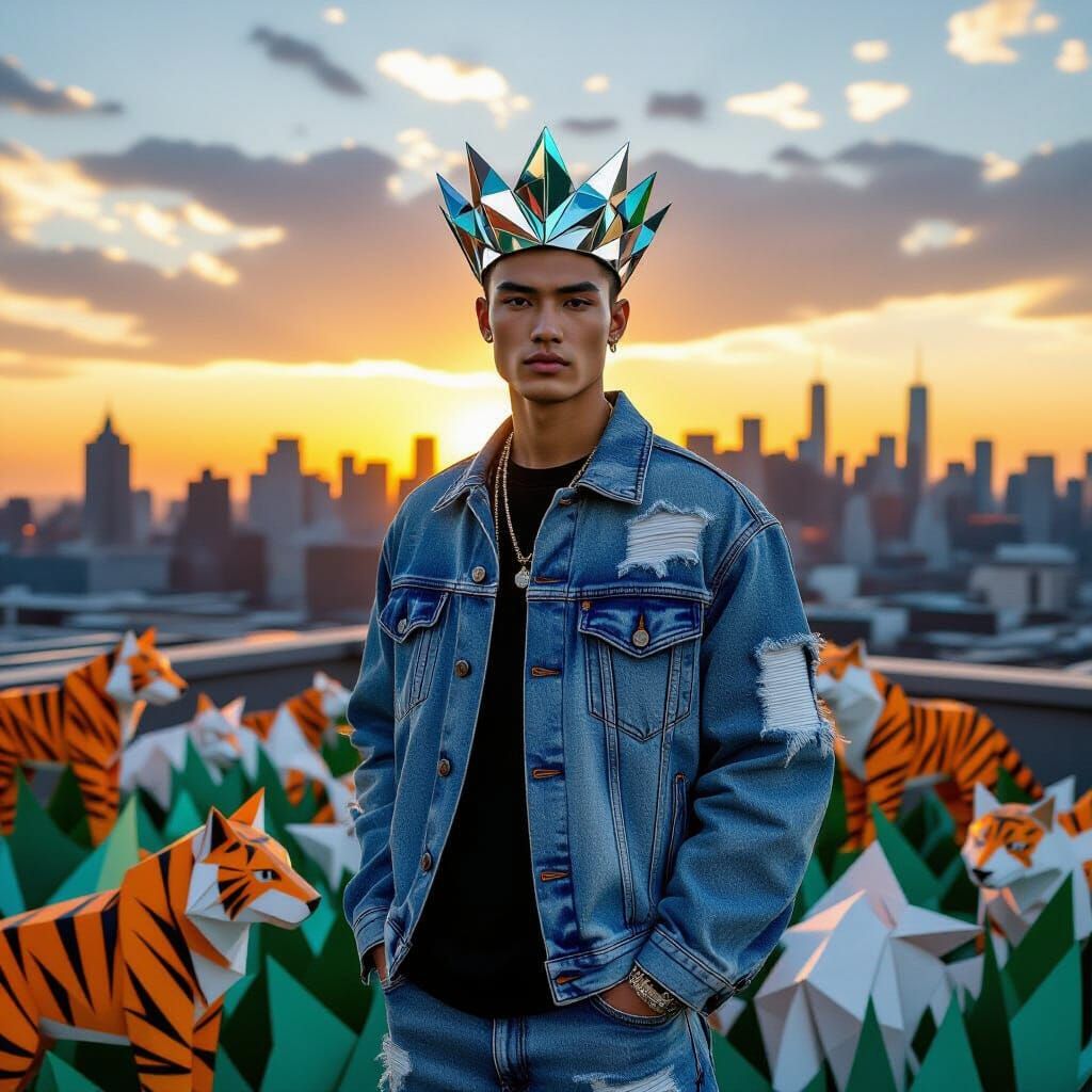 A striking picture of a streetwear model wearing an origami crown standing in a rooftop garden filled with origami animals. The sunset catches the paper folds in this cinematic photograph.