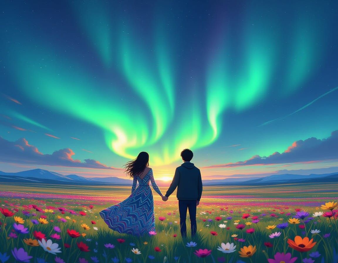 This image shows a couple hand-in-hand in a field of colorful flowers, watching a vivid aurora borealis. The scene is rendered in a magical realism style with rich colors.