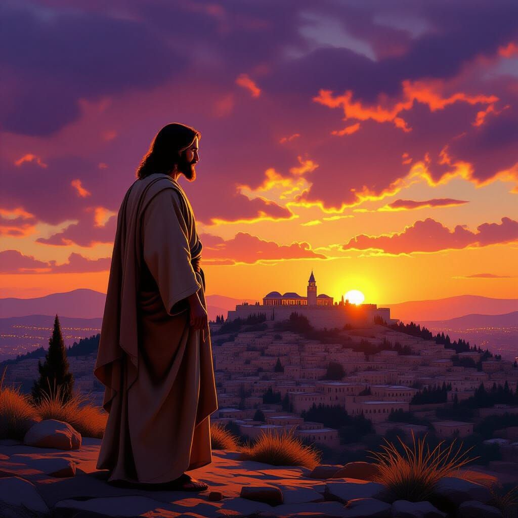 This image shows Jesus Christ overlooking Jerusalem at sunset. The dramatic lighting and vibrant colors evoke a Renaissance painting, rendered with hyperrealistic detail. The overall effect is both serene and powerful.