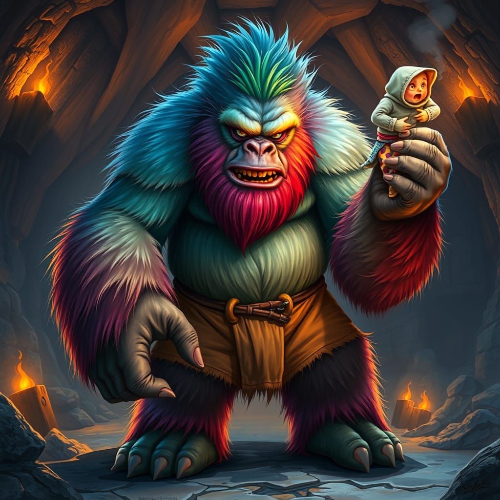 a giant multi-colored yeti with huge hairy feet and hands is wearing worn shorts. It is holding a small mini scared dwarf dressed in vibrant colored spotted clothes in its hand. Standing in a dungeon lit by torches. vibrant colors, airbrushed digital art