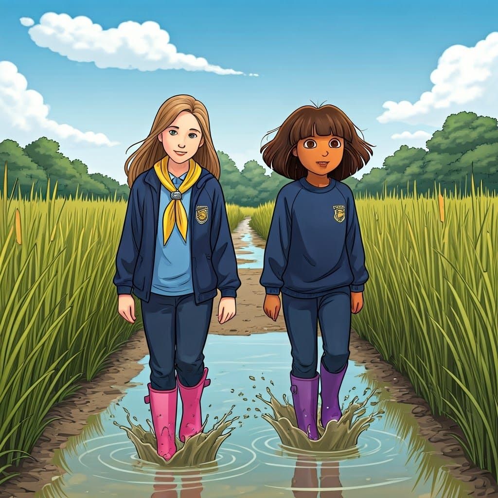 This image shows Brittany and Dora on a school trip through a wetland reserve. They navigate a muddy path, playfully splashing in puddles, their boots covered in mud.