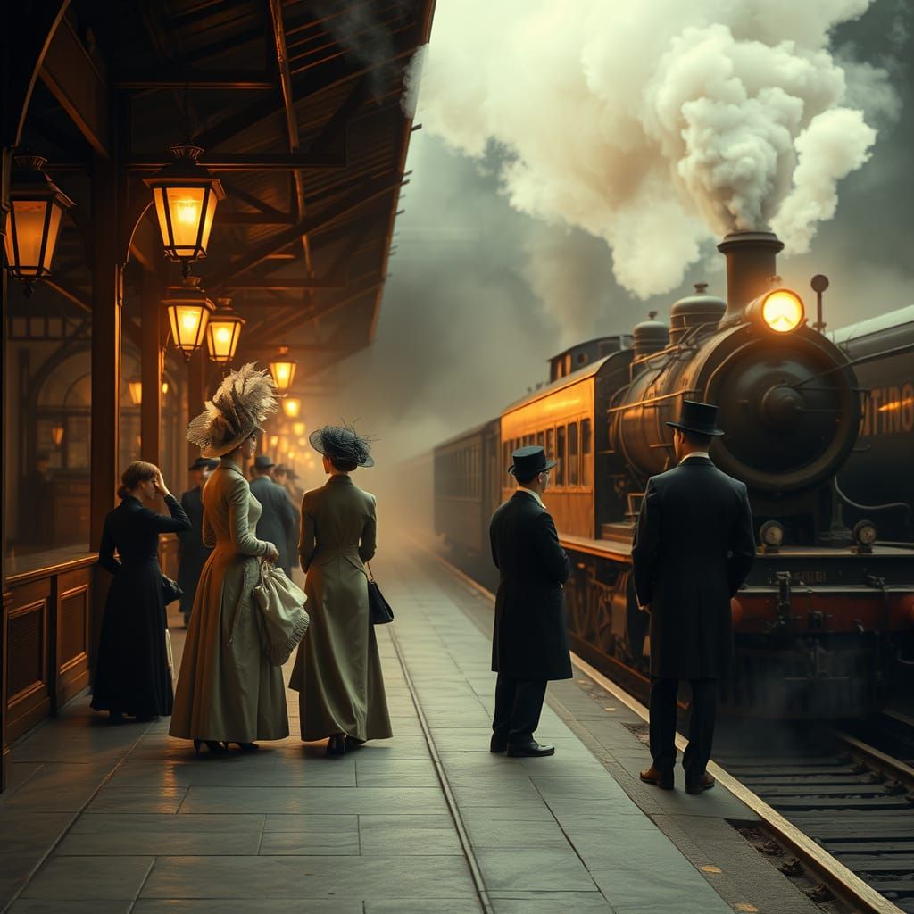 This image depicts a nostalgic scene at a vintage train station, featuring elegantly dressed men and women from the 1900s. Soft lighting and billowing steam create a dreamlike atmosphere.