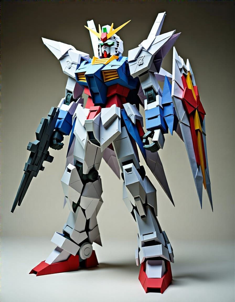 This image showcases a meticulously crafted origami Gundam figure, standing over two feet tall. The impressive model features articulated joints and intricate details, capturing the iconic mech's armored precision.