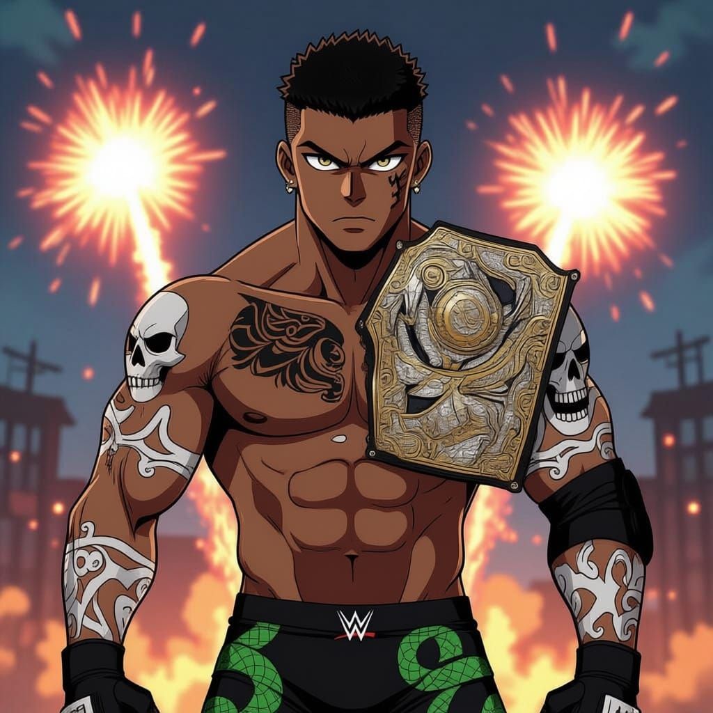 This image features a powerful young Black anime wrestler with striking tattoos and a championship belt. Intense pyro and dramatic lighting enhance the fierce, cel-shaded aesthetic.