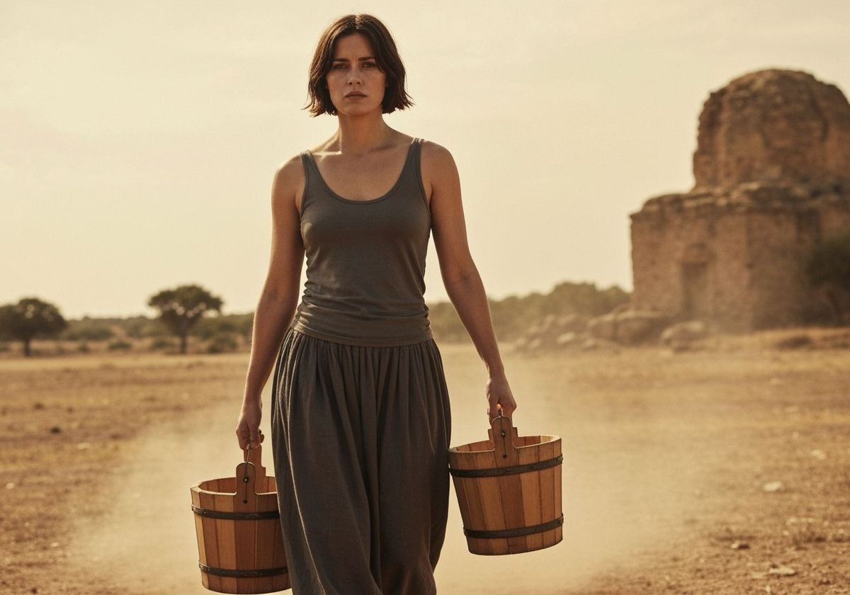 This image shows a woman carrying water in a rural landscape, with farm buildings and cows in the distance. The artwork is rendered with earthy tones and textures in a rustic realism style.