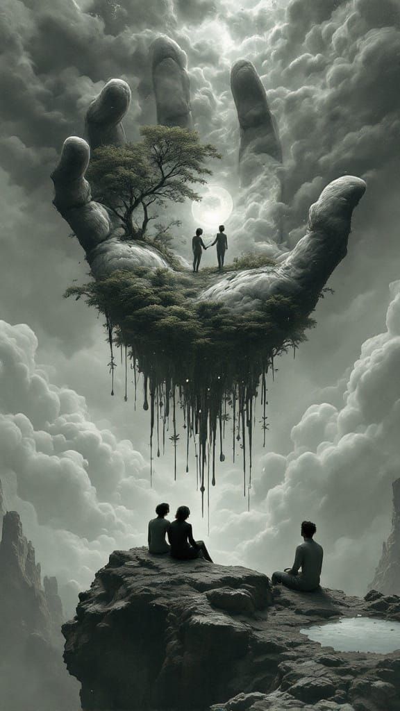 A surreal scene showing three figures overlooking a bio tech forest growing from a giant hand. Chalk dust clouds fill the sky, with molten glass creating an eerie atmosphere in surrealism style.